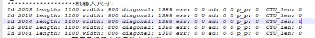 小车尺寸在算法日志直接搜关键字:机器人尺寸,可以查到算法收到的小车尺寸,一般撞车问题可以查看 算法收到的小车尺寸是否正确。
