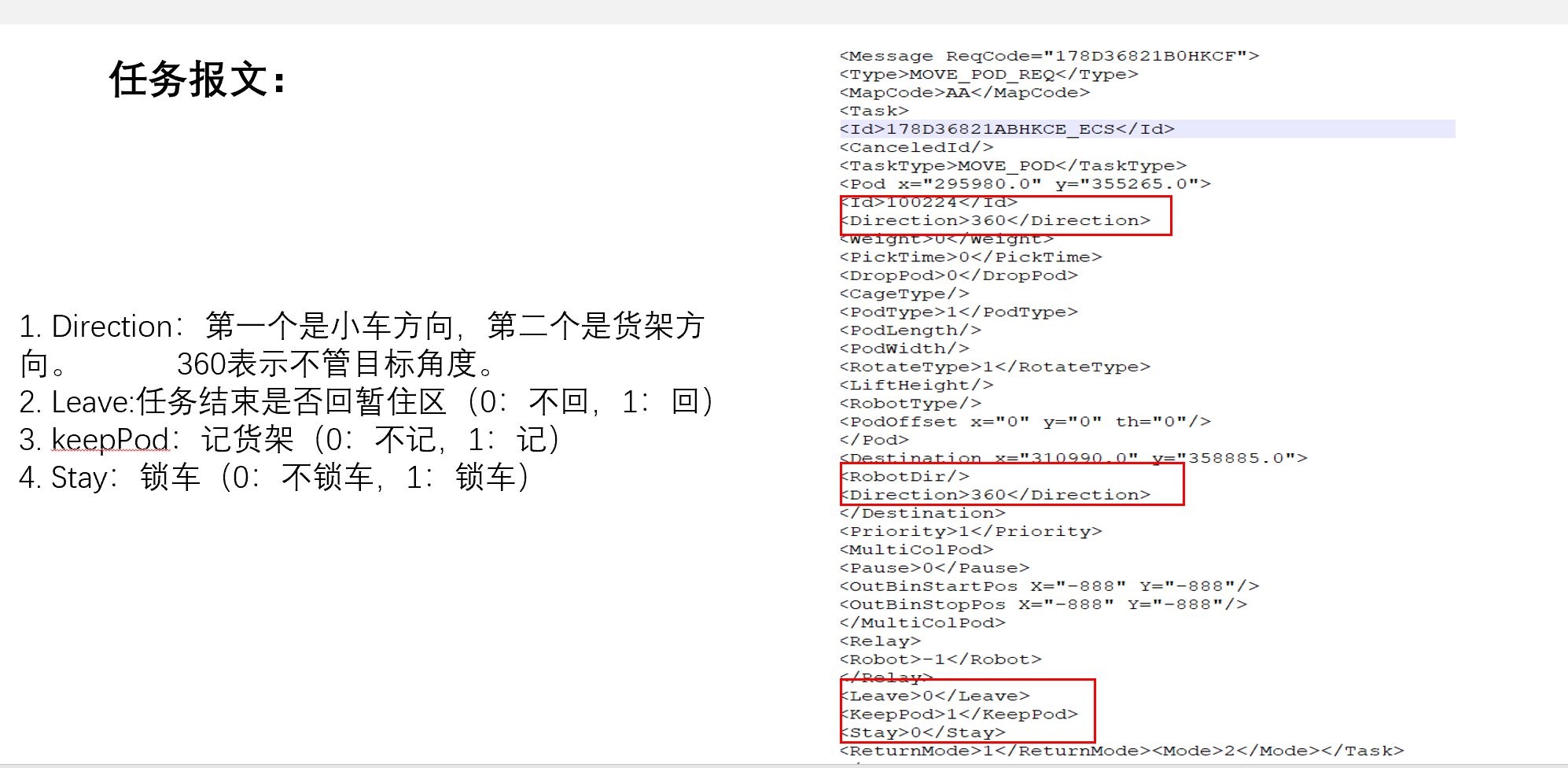 pod type:0正方型1长方形2盲举3正方型托盘4长方形托盘100~109对应pod_conf.xml货架列表中的第1到第10个货架cun pod_dir.货架运行角度999为不管pod_length/pod_width:货架长宽,slam车型使用货架列表时会替换成该值不使用货架列表时不能发0